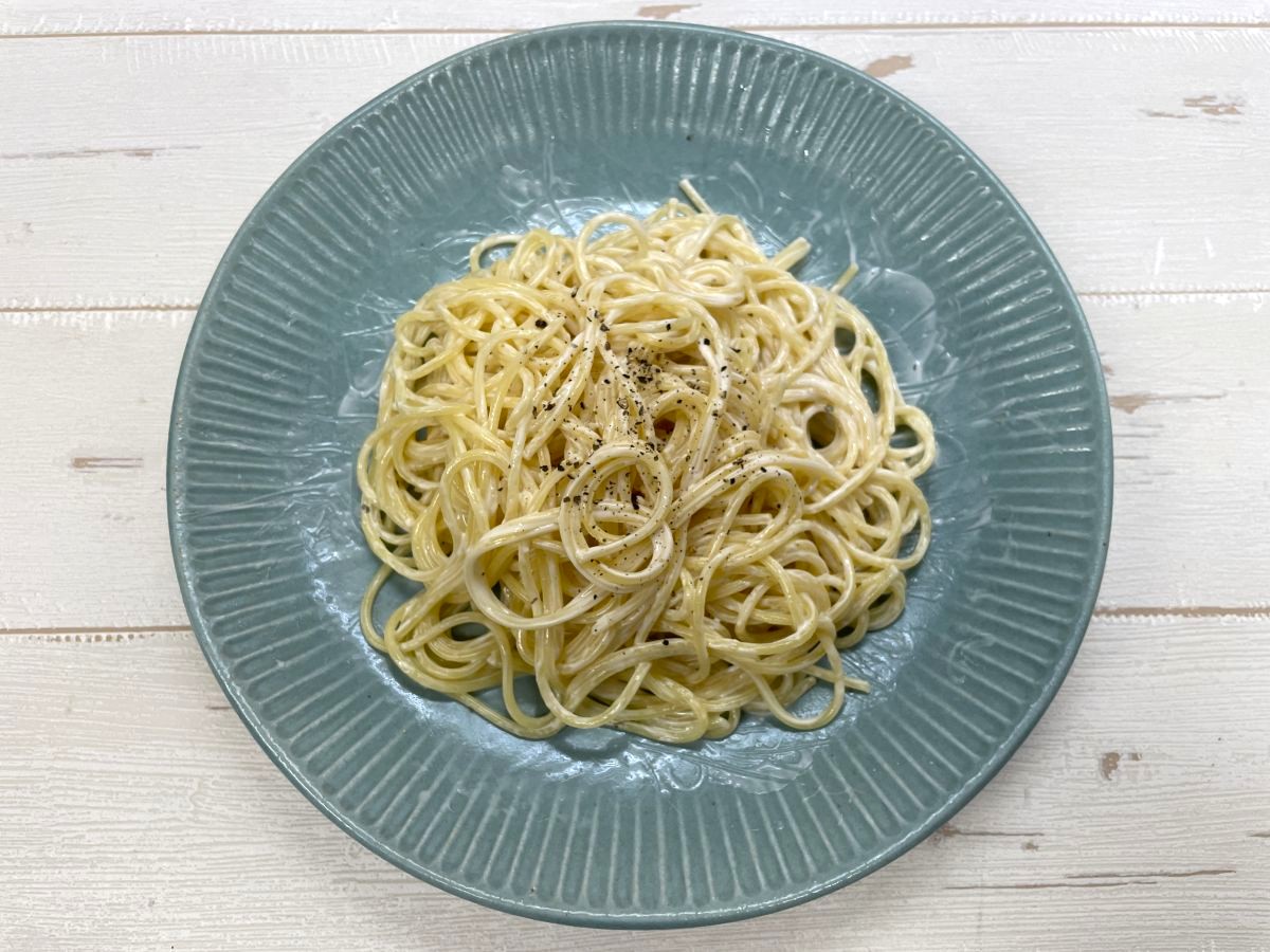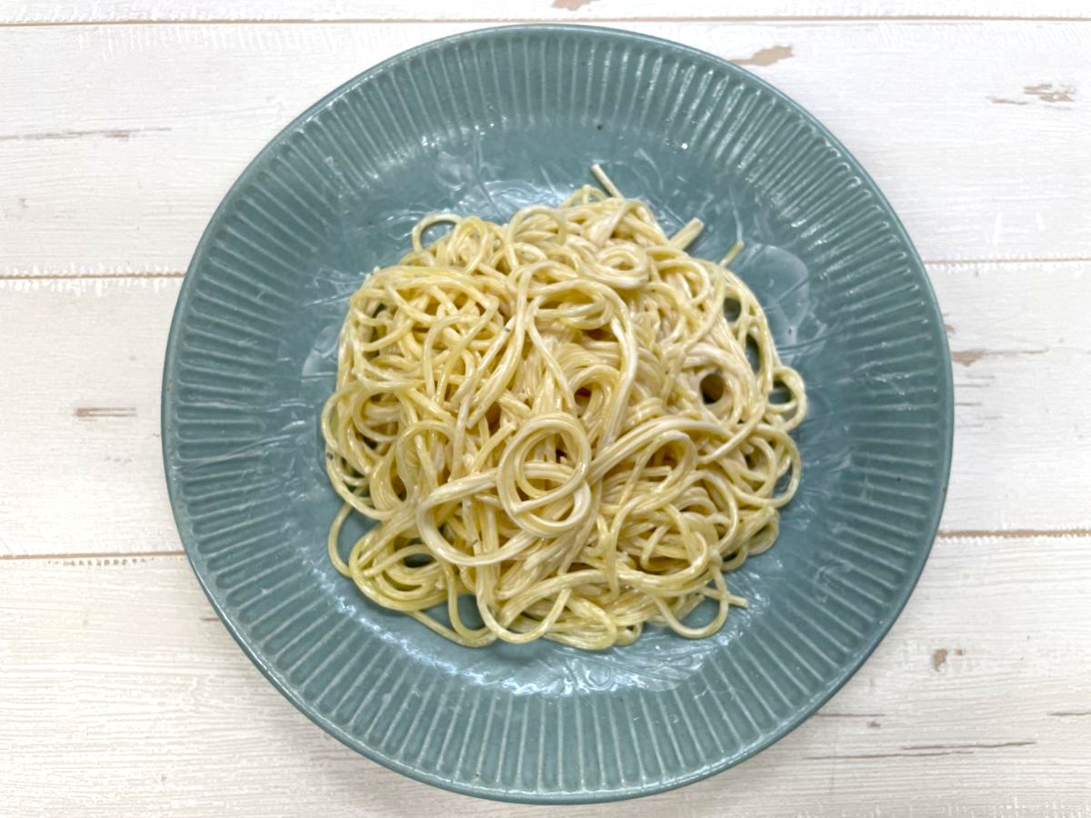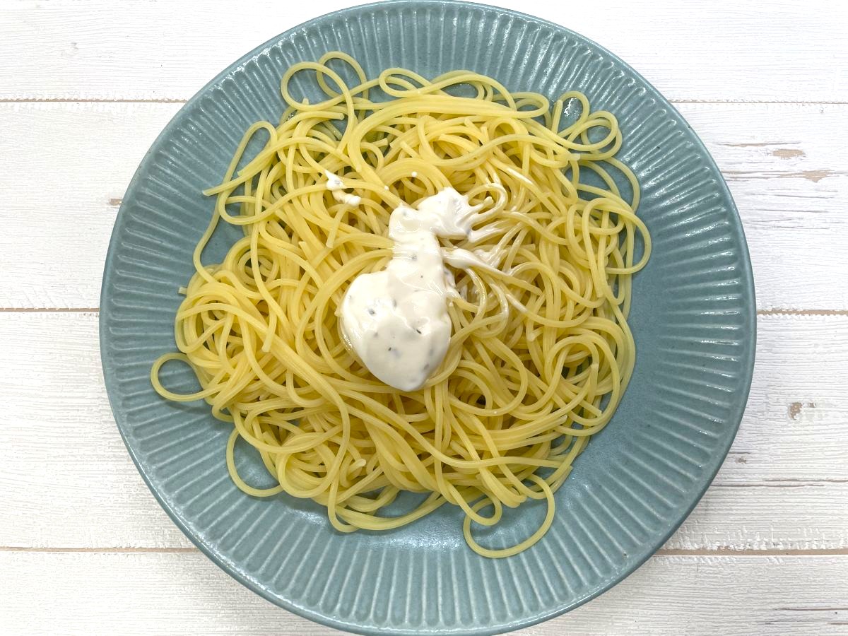 チーズの濃い感じは確かにあり、トロミも麺に絡んでいるためチーズ系のパスタとしては成立しており、アッサリ系のサラダパスタに近いものに仕上がりました。