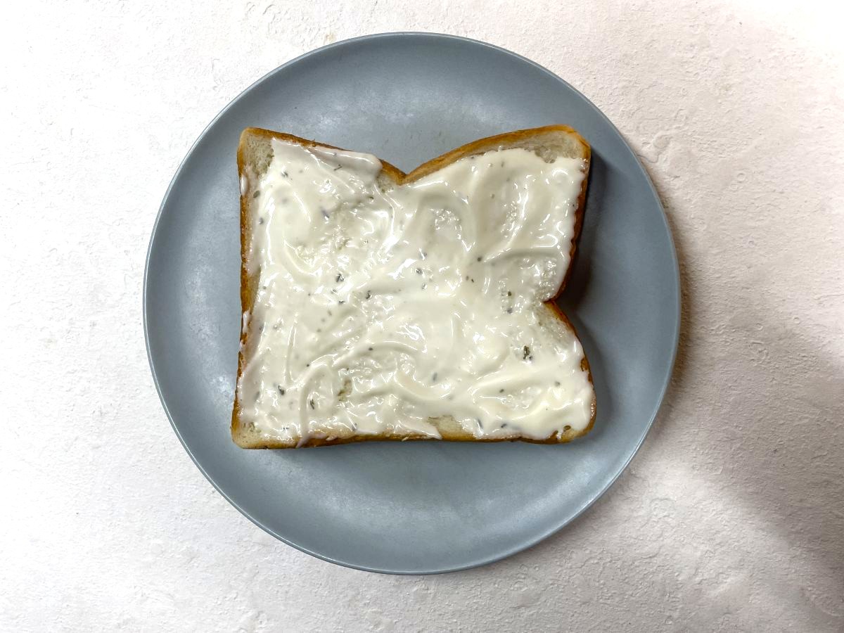 次に、食パンの表面にチーズフォンデュソースを一つ分塗り広げます。