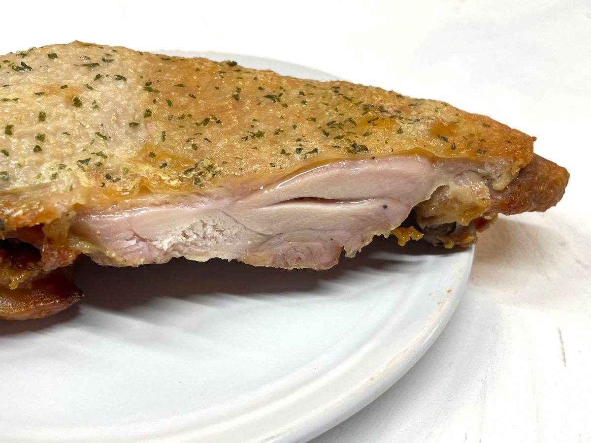 ハーブの塗された表面の鶏皮は余分な脂が存在しない薄さ具合。